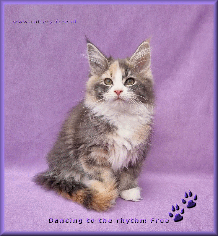 Poes:Dancing to the rhythm Free Kleur:blue tortie tabby white ticked Foto © Foto's Saskia Vissers De prijs van een kitten Monique & SaskiaReinoutlaan 1615665AR Geldrop0031-(0)40-2853613 Copyright© 2026 by author all rights reserved Cattery Free