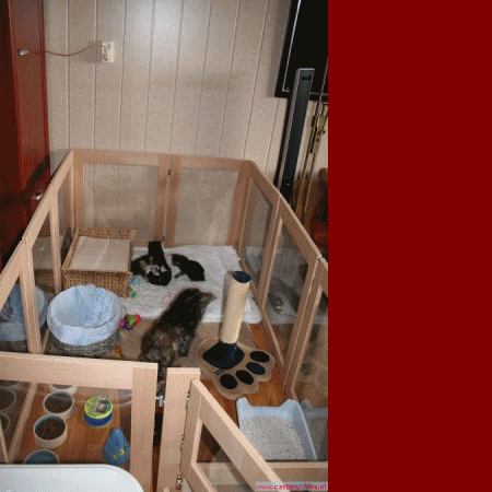 Vandaag zijn wij verhuisd naar de woonkamer. Nu hebben we echt een mooie ren tot onze beschikking! We hebben de grootste lol;-) Mams moet er wel een beetje aan wennen want eerst waren binnen "pootbereik" maar nu banjeren we de ren door en moet ze ons achterna komen als ze ons wil poetsen! Pap lusten we ook al graag dus we zijn al aardig op weg om groot te worden. Vandaag op 11-06-2008 weegt : Celebration 512gram.